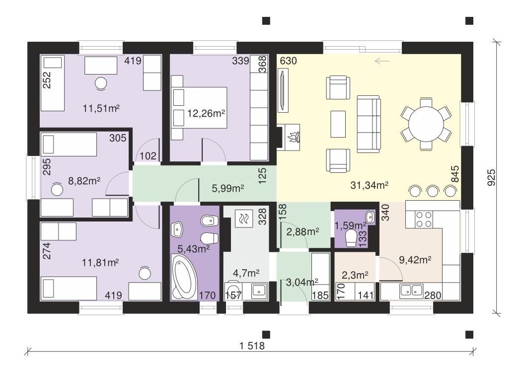 Pri tomto projekte ponúkame MOŽNOSŤ BEZPLATNEJ ZMENY DISPOZÍCIE! Pri každom projekte sme sa snažili vymyslieť tú najlepšiu dispozíciu aká je vzhľadom na vonkajší rozmer domu možná. Ale aj napriek tomu je často potrebné dispozíciu domu upraviť s ohľadom na osadenie domu na pozemok, preferencie klienta alebo stavebný systém. Ponúkame Vám preto možnosť bezplatnej zmeny dispozície každého nášho projektu tak aby vyhovoval vašim potrebám. Zmenou dispozície myslíme posuny nenosných priečok, zmenu umiestnenia a veľkosti okien, interiérových dverí a rozvodov inštalácií.