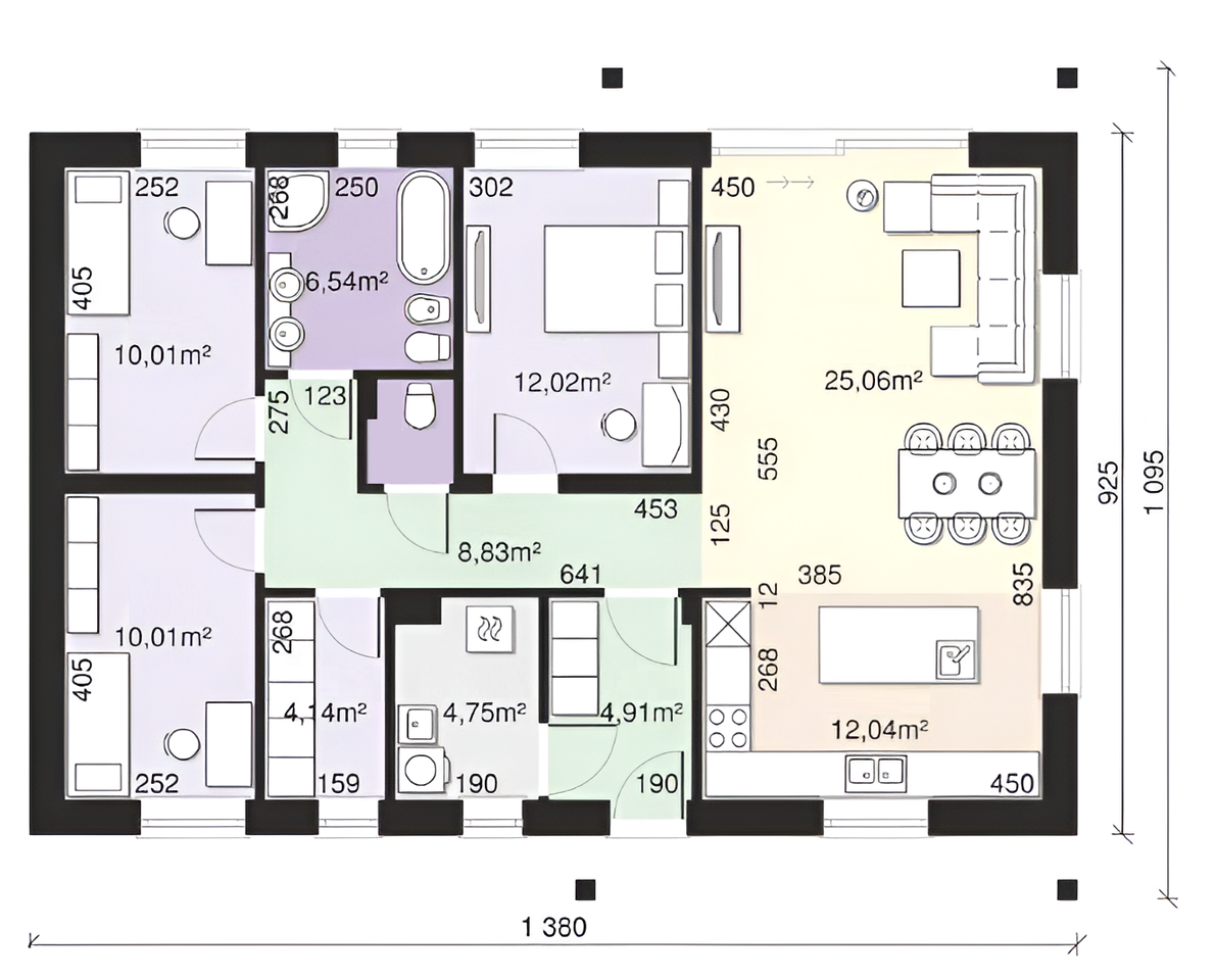 Pri tomto projekte ponúkame MOŽNOSŤ BEZPLATNEJ ZMENY DISPOZÍCIE! Všetky projekty je možné dodať ako energetickú triedu A0 alebo A1. Pri každom projekte sme sa snažili vymyslieť tú najlepšiu dispozíciu aká je vzhľadom na vonkajší rozmer domu možná. Ale aj napriek tomu je často potrebné dispozíciu domu upraviť s ohľadom na osadenie domu na pozemok, preferencie klienta alebo stavebný systém. Ponúkame Vám preto možnosť bezplatnej zmeny dispozície každého nášho projektu tak aby vyhovoval vašim potrebám. Zmenou dispozície myslíme posuny nenosných priečok, zmenu umiestnenia a veľkosti okien, interiérových dverí a rozvodov inštalácií. Cena výstavby uvedená pri projekte je za prevedenie kategórie A1 na kľúč, bez interiérového vybavenia, bez základov. Pre viac informácií a aktualizáciu ceny nás prosím kontaktujte.