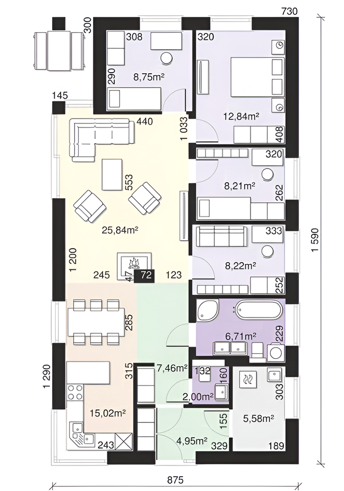 Pri tomto projekte ponúkame MOŽNOSŤ BEZPLATNEJ ZMENY DISPOZÍCIE! Všetky projekty je možné dodať ako energetickú triedu A0 alebo A1. Pri každom projekte sme sa snažili vymyslieť tú najlepšiu dispozíciu aká je vzhľadom na vonkajší rozmer domu možná. Ale aj napriek tomu je často potrebné dispozíciu domu upraviť s ohľadom na osadenie domu na pozemok, preferencie klienta alebo stavebný systém. Ponúkame Vám preto možnosť bezplatnej zmeny dispozície každého nášho projektu tak aby vyhovoval vašim potrebám. Zmenou dispozície myslíme posuny nenosných priečok, zmenu umiestnenia a veľkosti okien, interiérových dverí a rozvodov inštalácií. Cena výstavby uvedená pri projekte je za prevedenie kategórie A1 na kľúč, bez interiérového vybavenia, bez základov. Pre viac informácií a aktualizáciu ceny nás prosím kontaktujte.