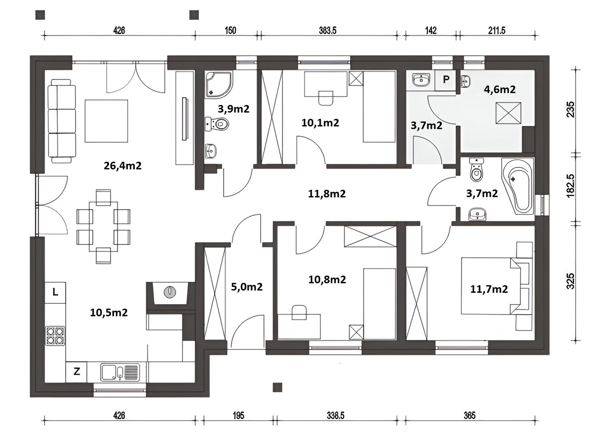 Pri tomto projekte ponúkame MOŽNOSŤ BEZPLATNEJ ZMENY DISPOZÍCIE! Všetky projekty je možné dodať ako energetickú triedu A0 alebo A1. Pri každom projekte sme sa snažili vymyslieť tú najlepšiu dispozíciu aká je vzhľadom na vonkajší rozmer domu možná. Ale aj napriek tomu je často potrebné dispozíciu domu upraviť s ohľadom na osadenie domu na pozemok, preferencie klienta alebo stavebný systém. Ponúkame Vám preto možnosť bezplatnej zmeny dispozície každého nášho projektu tak aby vyhovoval vašim potrebám. Zmenou dispozície myslíme posuny nenosných priečok, zmenu umiestnenia a veľkosti okien, interiérových dverí a rozvodov inštalácií. Cena výstavby uvedená pri projekte je za prevedenie kategórie A1 na kľúč, bez interiérového vybavenia, bez základov. Pre viac informácií a aktualizáciu ceny nás prosím kontaktujte.