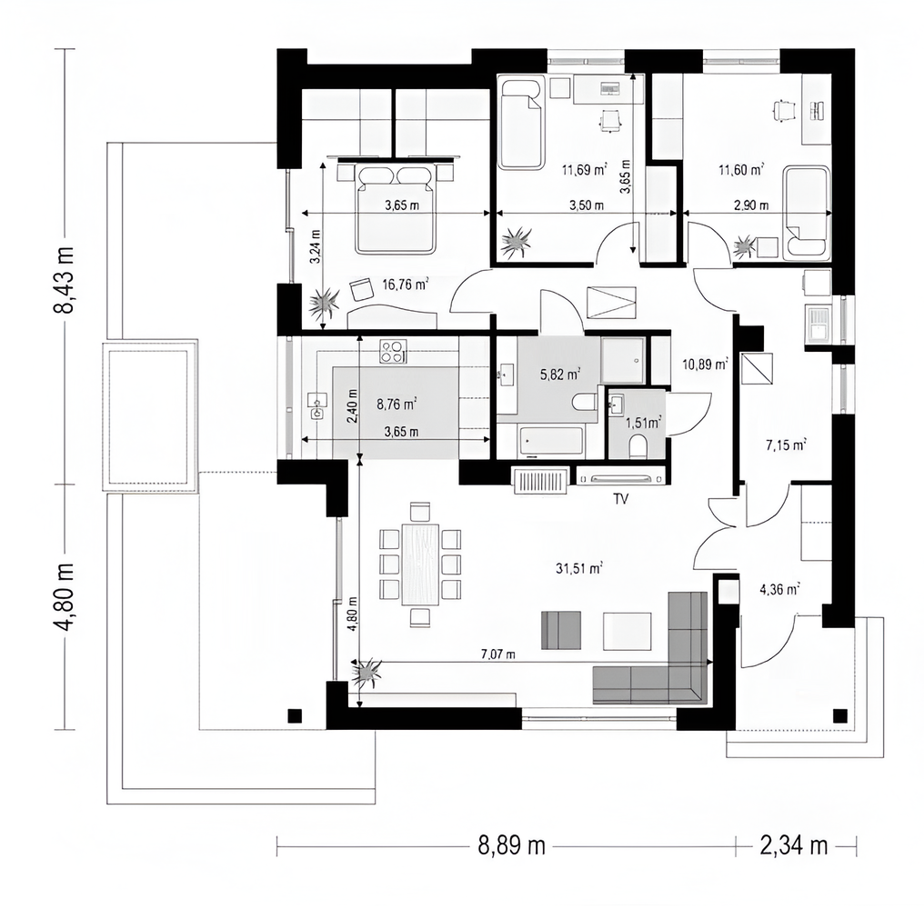 Pri tomto projekte ponúkame MOŽNOSŤ BEZPLATNEJ ZMENY DISPOZÍCIE! Pri každom projekte sme sa snažili vymyslieť tú najlepšiu dispozíciu aká je vzhľadom na vonkajší rozmer domu možná. Ale aj napriek tomu je často potrebné dispozíciu domu upraviť s ohľadom na osadenie domu na pozemok, preferencie klienta alebo stavebný systém. Ponúkame Vám preto možnosť bezplatnej zmeny dispozície každého nášho projektu tak aby vyhovoval vašim potrebám. Zmenou dispozície myslíme posuny nenosných priečok, zmenu umiestnenia a veľkosti okien, interiérových dverí a rozvodov inštalácií.