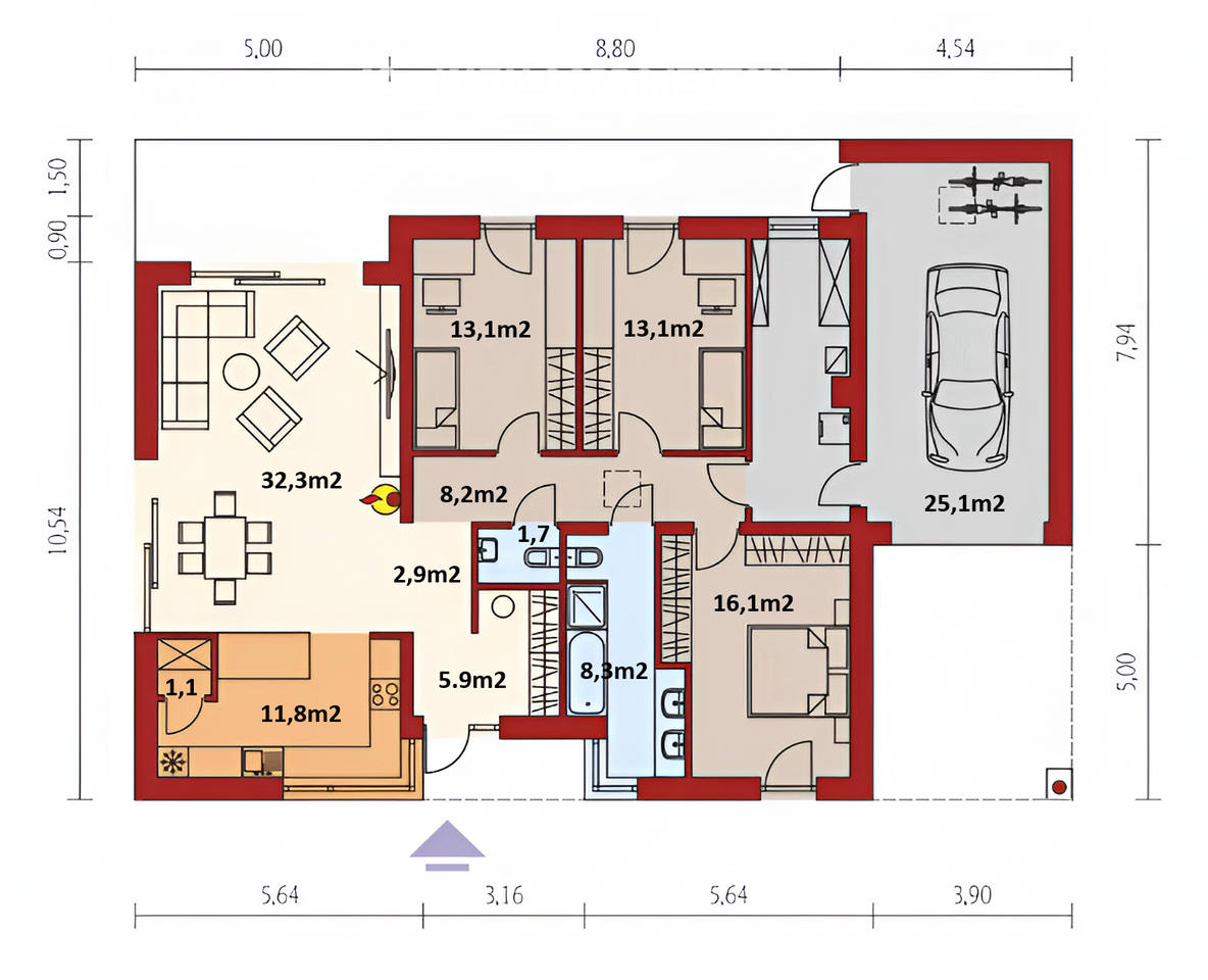 Pri tomto projekte ponúkame MOŽNOSŤ BEZPLATNEJ ZMENY DISPOZÍCIE! Všetky projekty je možné dodať ako energetickú triedu A0 alebo A1. Pri každom projekte sme sa snažili vymyslieť tú najlepšiu dispozíciu aká je vzhľadom na vonkajší rozmer domu možná. Ale aj napriek tomu je často potrebné dispozíciu domu upraviť s ohľadom na osadenie domu na pozemok, preferencie klienta alebo stavebný systém. Ponúkame Vám preto možnosť bezplatnej zmeny dispozície každého nášho projektu tak aby vyhovoval vašim potrebám. Zmenou dispozície myslíme posuny nenosných priečok, zmenu umiestnenia a veľkosti okien, interiérových dverí a rozvodov inštalácií. Cena výstavby uvedená pri projekte je za prevedenie kategórie A1 na kľúč, bez interiérového vybavenia, bez základov. Pre viac informácií a aktualizáciu ceny nás prosím kontaktujte.